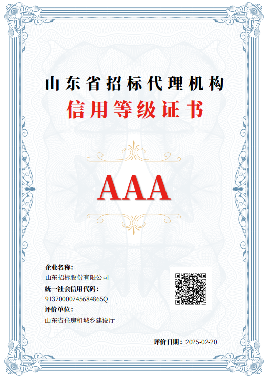 山东省招标代理机构信用评价报告AAA级证书